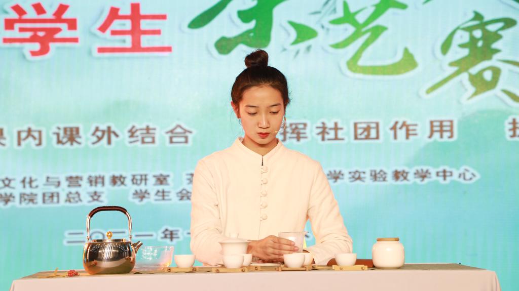 11月18日下午,暖阳高照。beat365在线平台官网第十七届学生茶艺大赛(决赛)在校大学生活动中心隆重举行。大赛由beat365在线平台官网茶学院主办,茶文化与营销教研室、茶学教研室、茶学院团总支、茶学院学生会、茶艺社团承办,河南蓝天茶业有限公司、瓦库文化传播股份有限公司联合赞助。茶学院学生、其他学院学生、各院社团代表及社会各界爱茶人士现场和通过线上直播的方式一起观看了比赛。 校党委副书记王庆兵、校党委副书记黄松、校党委学生工作部部长简頻捷、校团委书记王鹏、教学质量监控与评估中心主任张淮、教务处副处长赵亮、教师发展中心副主任孙君艳、信阳市文化广电和旅游局非物质文化遗产科科长王清丰、茶学院院长郭桂义、茶学院副院长陈义观摩指导。大赛邀请信阳市职业技能鉴定指导中心主任杜丽华,园艺学院插花艺术教师、河南省压花协会副秘书长杨丽,茶学院党总支副书记朱建梅老师,茶学院办公室主任、音乐学硕士池水婧,茶学院团总支书记王子浩,茶学院茶文化与营销教研室副主任王杉,茶学院茶文化硕士卫艺炜,上任茶艺社团会长杨子贤同学等担任大赛评委。 本届大赛历时70余天,期间通过预选、初赛、重新编创等程序,最终选拔出九组选手进入决赛。决赛茶艺题材丰富多彩,展现了我国茶艺事业的蓬勃发展。选手们将茶艺理论知识人文素养知识相融合,不断充实表演内容,提炼茶艺主题思想,用完整流畅且富有观赏性的形式展现风采。其中有展现河南文化底蕴与悠久历史的《梓乡河南·茶语》;有鲁迅先生的《喝好茶,享“清福”》之道,有一杯清茶致敬屈原高洁灵魂的《皎如明月,屈子修洁》、有跨越海峡重归故里的《海峡情久,浅茶系心》,还有展示宋代点茶风貌的《宋代茶事》,彰显革命英烈追逐光明的《觉醒年代(新编)》,呈现青春中的迷茫与美好,相依与扶持的《玫瑰少年》、《放下》、《喝杯好茶,致意青春》。参赛选手,以茶表心意,以茶敬先辈,以茶建联结,以茶融情怀。2019级茶学(对本)班的马如阳同学,为大家汇报演出的歌曲《欢》使得现场喝彩声不断。经过近三小时的现场比拼,茶艺大赛圆满结束。最后主持人宣布:大赛将在第十七届茶文化周闭幕式上进行颁奖。 beat365在线平台官网学生茶艺大赛自2004开始,已成功举办了十七届。目前,茶学院已经形成具有院系特色的“理论实践结合,课内课外结合,发挥社团作用,提高实践技能”的综合素质培养模式。并建有河南省非物质文化遗产研究基地、信阳市非物质文化遗产研究中心(信阳毛尖茶制作技艺 茶艺)、信阳市非物质文化遗产社会传承基地(信阳毛尖茶制作技艺 茶艺)等。积极组织开展茶艺技能等竞赛活动,既能以赛促教,提升教师专业技能和专业技能指导水平,又能以赛促学,激发学生的兴趣和潜能,全面提高学生实践技能和综合素质,让更多的人知茶、爱茶,共品茶香茶韵,共享美好生活。(撰稿人:王杉 审稿人:郭桂义)