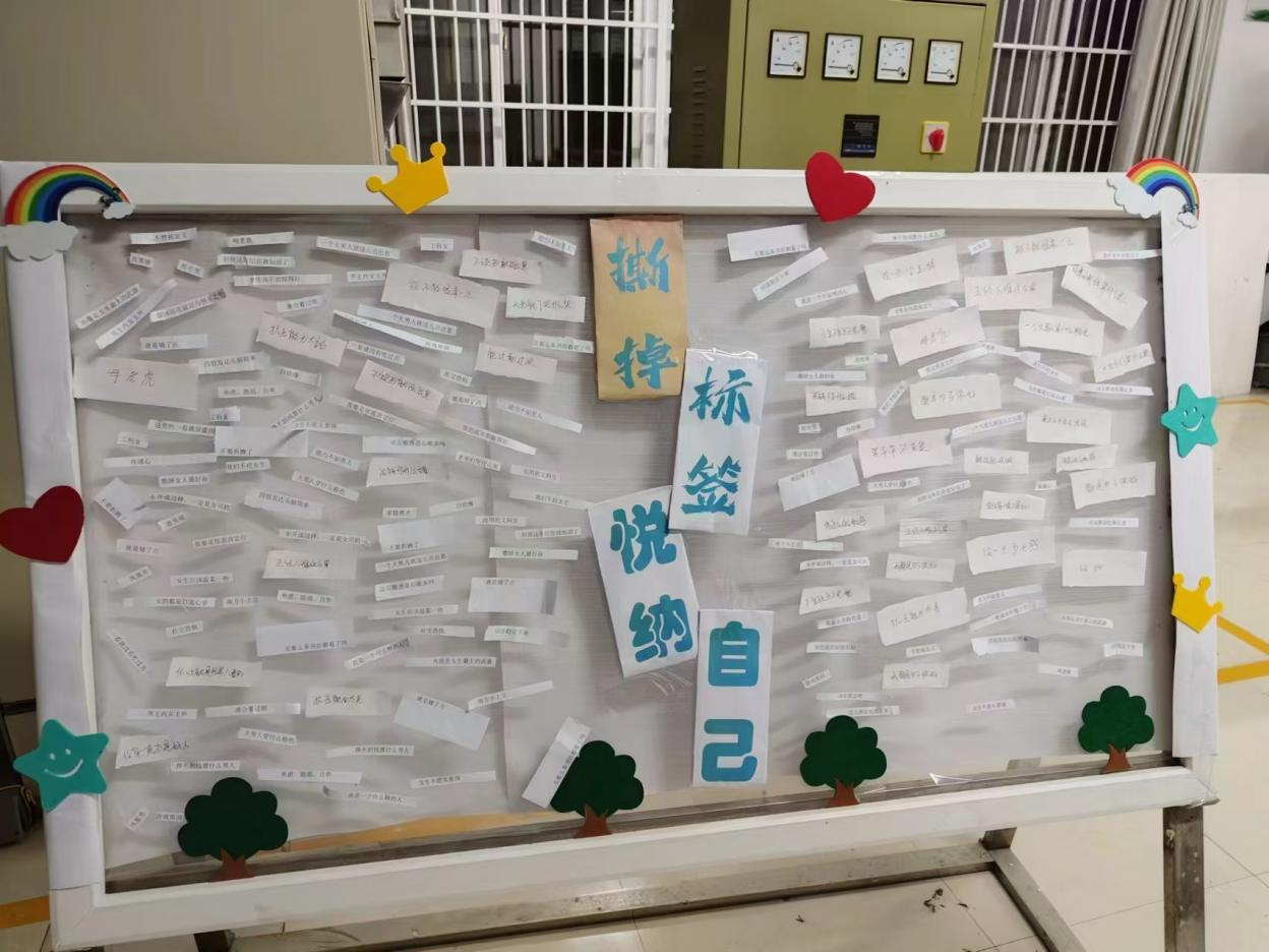撕标签环节,同学们纷纷将自己曾经被贴上的标签写在纸上,然后勇敢地撕下这些标签,将它们丢入垃圾桶中。这个简单的仪式让同学们感受到了摆脱束缚的轻松和愉悦,也让他们更加坚定了悦纳自己的决心。