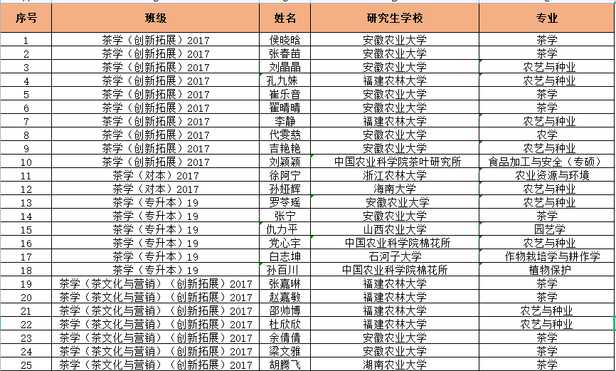 2021年全国硕士研究生考试结果已经揭晓,茶学院2021届本科毕业生人共129人,其中报考研究生55人,通过国家线25人,录取25人,考研录取率19%