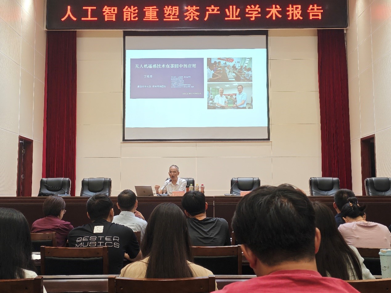 报告会上,丁教授系统阐述了人工智能技术在传统茶产业转型升级中的重要意义,指出当前茶产业正面临劳动力短缺、生产效率不高、标准化程度不足等发展瓶颈,而人工智能技术为实现茶产业现代化提供了新的解决方案。他重点介绍了高通量表型与数字化平台、先进传感技术在茶树生长性状精准获取中的应用,以及多组学数据整合建立的种质资源数字化评价体系。此外,丁教授还分享了数字化快繁和计算育种技术体系,展示了如何借助AI实现从“经验育种”到“精准育种”的转变,显著提高育种效率。丁教授的报告展示了多项人工智能技术在茶叶生产中的实际应用效果,引起了在场师生的浓厚兴趣。