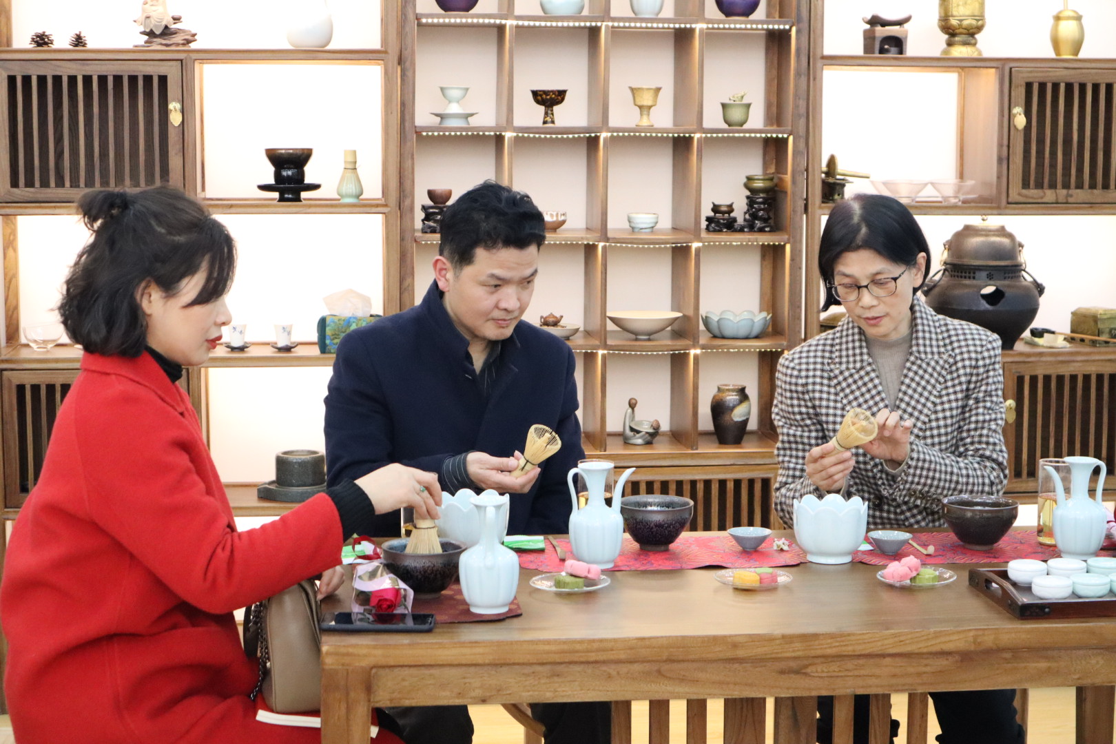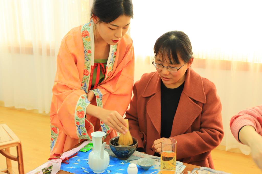 随后,在茶学院专业教师王杉的带领下,大家开启了传统文化体验之旅。同学们首先展示了校第十七届茶艺大赛优秀作品《宋代茶事》,再由王老师讲解点茶技术要点,随后老师们开始体验。两个多小时的活动,让女教师们从繁忙的工作中小憩片刻、放松身心,看着一碗普普通通的茶汤在自己的手下慢慢形成绵而厚的雪白茶沫,最后再画上自己喜欢的图案,沉浸其中又十分有趣,充分感受到了宋代茶文化的魅力。大家兴致勃勃地体验冲泡技巧,举杯学茶艺、低头品香茗,在茶韵茶香中,观茶艺、赏茶道、学茶礼,现场茶香四溢、暖意融融。