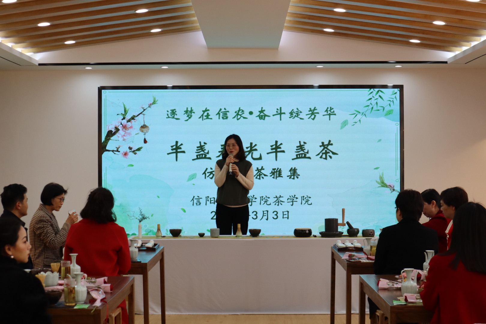 3月3日下午,由校工会主办、茶学院承办的“逐梦在信农·奋斗绽芳华”2022年庆“三八”国际妇女节活动——仿宋点茶雅集在茶学院茶文化实验室举行。副校长王万玲参加活动并现场指导,校工会相关负责同志,茶学院班子成员、各分工会女职工代表30余人参与了活动雅集。活动由茶学院党总支副书记、工会主席朱建梅主持。