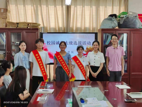 为了树立诚信观念,引导同学们充分认识开展诚信教育活动的重要性和必要性,有效地将诚信教育转化为大学生自觉的素养与行为,茶学院628日下午于2C501开展校园诚信大使选拔活动。茶学院辅导员丁岚、梁玉洁、杜之正出席并担任评委。