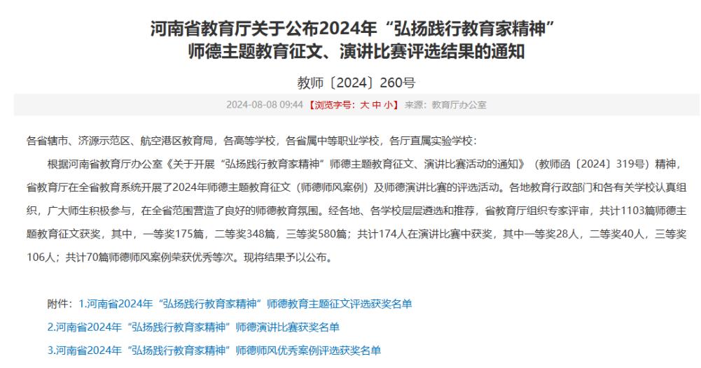 近日,河南省教育厅印发了《关于公布 2024 年“弘扬践行教育家精神”师德主题教育征文、演讲比赛评选结果的通知》(教师〔2024〕260 号),beat365在线平台官网荣获师德主题教育征文二等奖2项、三等奖3项。