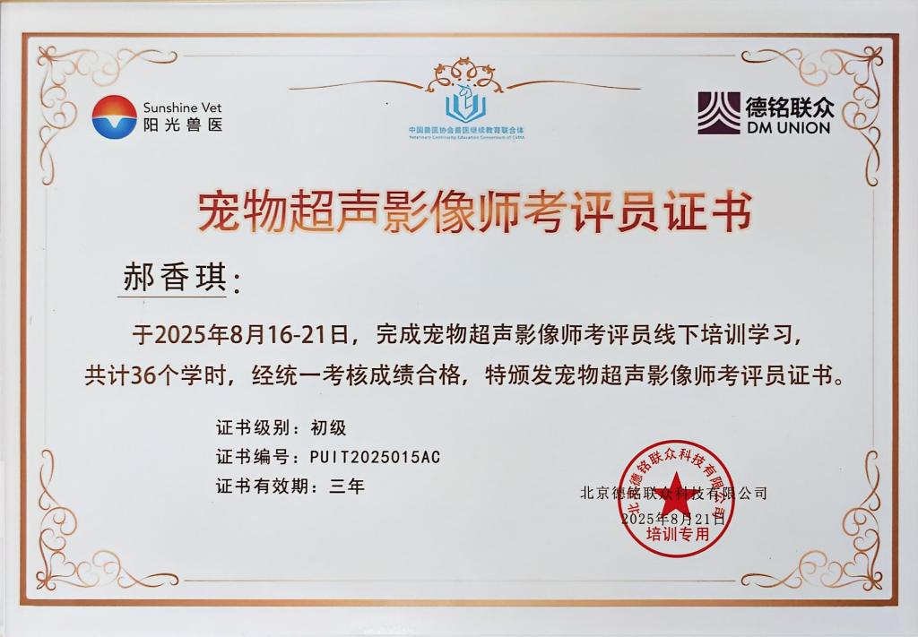 2025年8月16日至21日,由中国小动物影像技能大赛主办、阳光兽医继续教育学苑承办、河南力派教育协办的第三期影像技术师资培训班在郑州阳光兽医培训中心成功举办。我院教师郝香琪与来自全国多所高校的兽医影像学教师共同参加了此次培训。