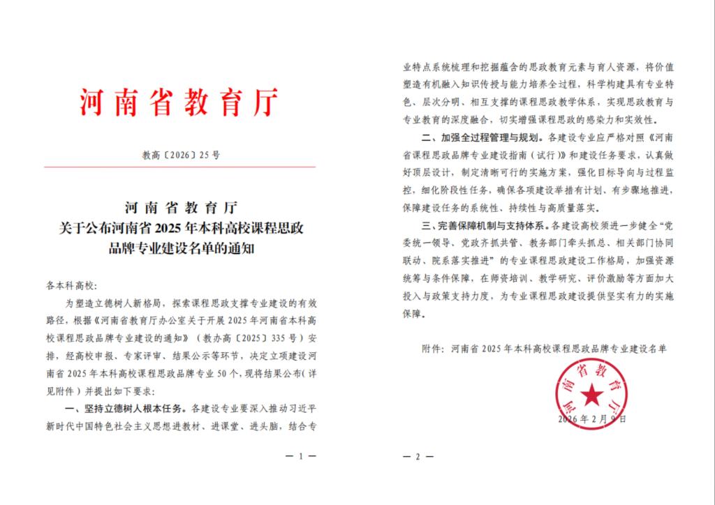 近日,河南省教育厅印发《关于公布河南省2025年本科高校课程思政品牌专业建设名单的通知》,我院动物医学专业成功获批立项建设,成为全省50个课程思政品牌专业之一。此次入选,是学院持续推进专业教育与思想政治教育深度融合、全面提升人才培养质量取得的又一重要成果。