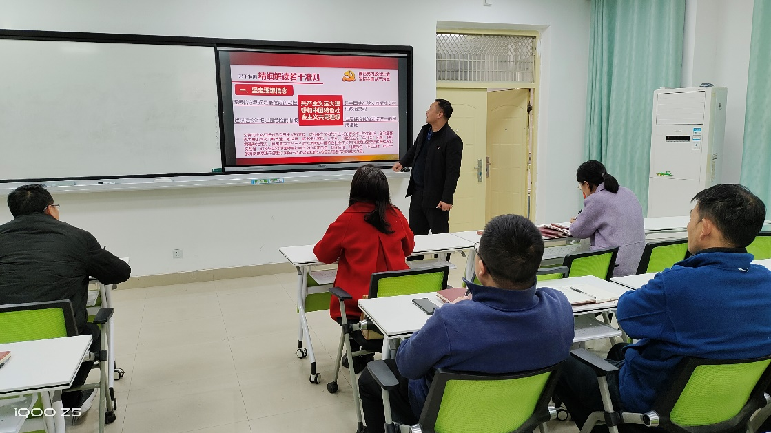 会上,党支部宣传委员李治利对《关于新形势下党内政治生活的若干准则》的基础知识、序言及主体内容进行了详细解读,围绕坚定理想信念、坚持党的基本路线、坚决维护党中央权威、严明党的政治纪律、保持党同人民群众的血肉联系、坚持民主集中制原则、发扬党内民主和保障党员权利、坚持正确选人用人导向、严格党的组织生活制度、开展批评和自我批评、加强对权力运行的制约和监督、保持清正廉洁的政治本色共十二个方面进行解读并提出明确要求,鼓励教师充分发挥党员先锋模范作用,为学校学院发展贡献力量。