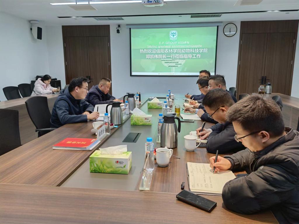 在正大集团(南阳)运营中心,院长邓凯伟与正大集团河南区副总裁王停战及相关部门负责人进行座谈,王停战副总裁介绍了正大集团的主要产业布局、发展规划,重点介绍了正大集团与信阳市政府的乡村振兴合伙人合作的具体进展。邓凯伟院长分别介绍了正大创新班的管理模式、现代养殖产业学院建设规划、教师的横向课题合作、双师型教师培养和学生实习与就业等方面。今后,学院将与正大集团在学生培养与就业、教师专业能力提升和深化产业学院建设等方面继续深入合作,主动融入信阳市政府与正大集团合作的乡村振兴合伙人项目,为信阳的乡村振兴贡献力量。