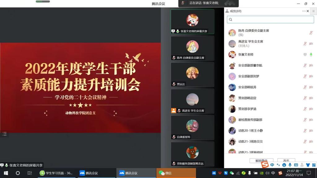 2022年11月14日,动物科技学院2022年度学生干部素质能力培训会顺利召开。团总支书记张喜文老师、2022年度新一届学生干部参加了此次培训大会。