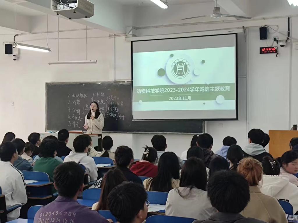 2023年11月24日,动物科技学院举行高校助学贷款合同签订仪式暨诚信主题教育和高校助学贷款诚信宣誓仪式,学院资助专员陶梦筱老师主持本次会议。