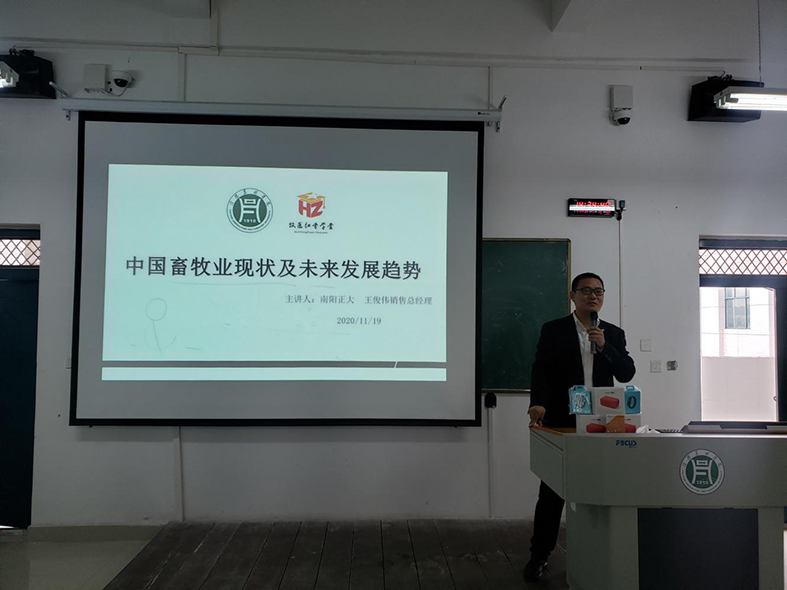 1119日下午,正大集团河南区的优秀代表,南阳正大的销售总经理王俊伟为牧医工程学院学生做了题为《中国畜牧业现状及未来发展趋势》的讲座,18级动物医学和18级动物科学为主的院内学生参加了讲座。