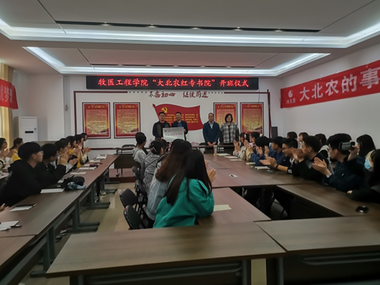 2021年4月20日中午,“大北农红专书院”在红专书院活动室举行开班仪式。“大北农红专书院”由大北农集团股份有限公司和牧医工程学院联合创建。大北农中原区总经理付记北、大北农中原区副总经理王文强,大北农中原区人力主管李玉丹,牧医工程学院党总支副书记张广强、就业专员尹磊以及全体“大北农红专书院”学生参会。会议由尹磊主持。