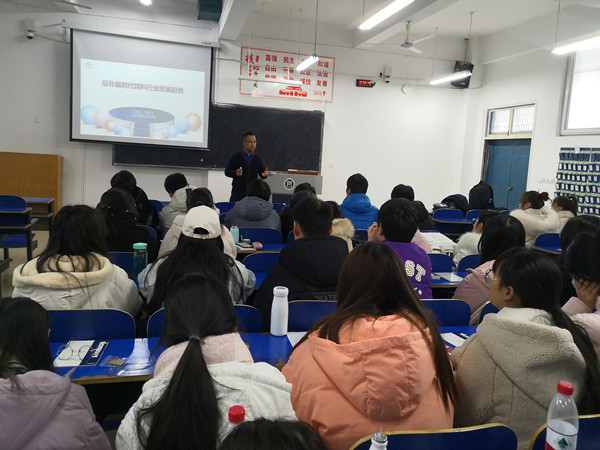 贾科众副总裁首先感谢了学院提供的良好平台;随后,贾总分享了自己在农林学院求学的经历并勉励学弟学妹们珍惜大学时光;最后,贾总做了一场题为“后非瘟时代饲料行业发展趋势”,贾总结合行业现状及自身丰富经验,深入浅出地为同学们分析了行业发展趋势。