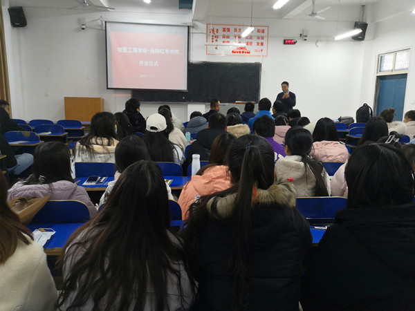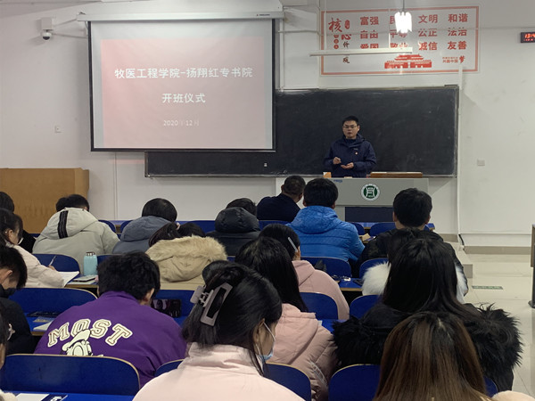 2020年12月15日中午,“扬翔红专书院”在一教A104教室举行开班仪式。“扬翔红专书院”由扬翔股份有限公司和牧医工程学院联合创建。扬翔股份河北区副总裁贾科众、扬翔股份河南河北区人力总监邓志林,牧医工程学院党总支副书记张广强、就业专员尹磊以及全体“扬翔红专书院”学生参会。