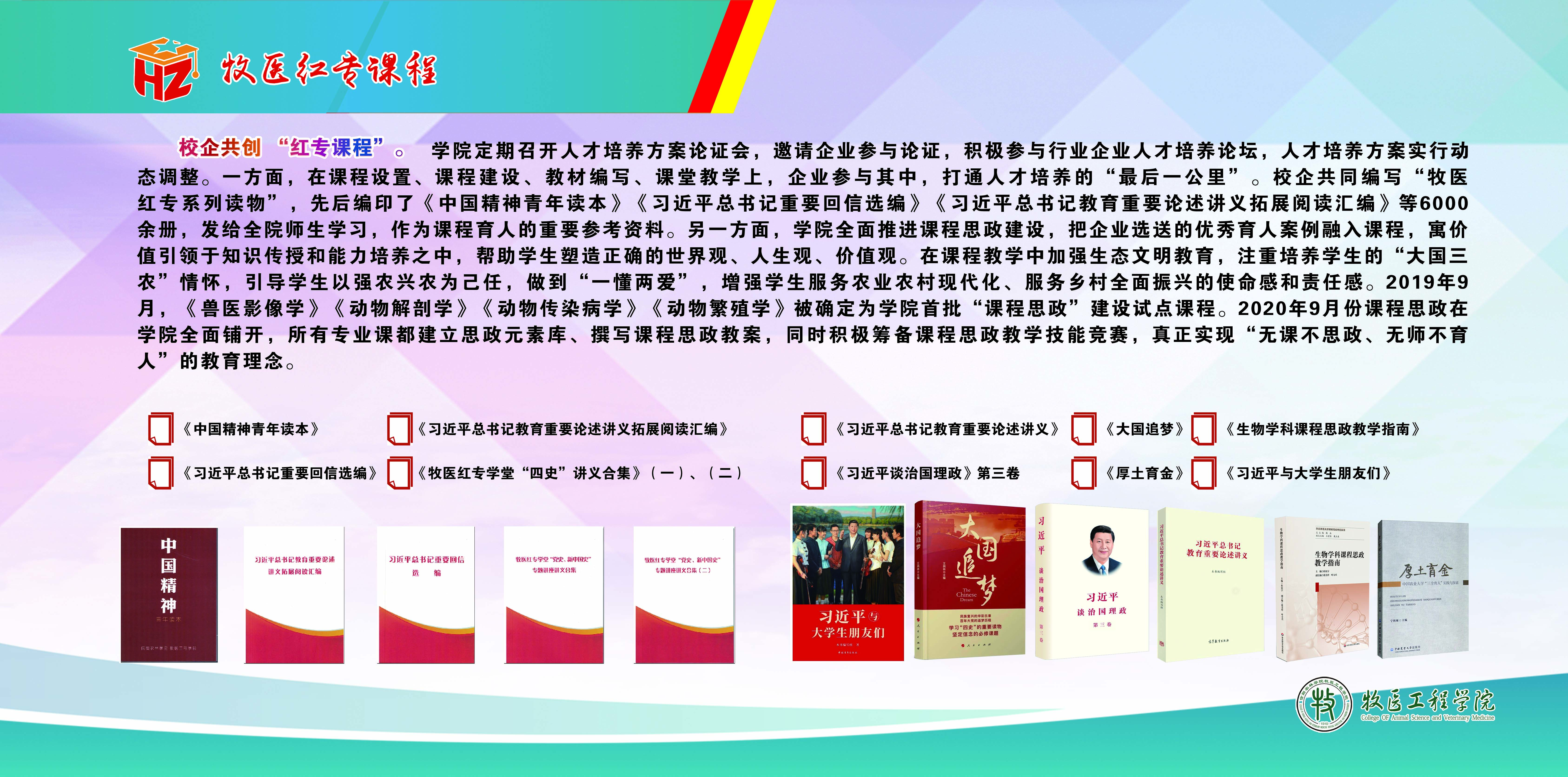 2020年3月,学院联合优势企业,共同编制“牧医红专课程”,先后编印了《中国精神青年读本》《习近平总书记重要回信选编》《习近平总书记教育重要论述讲义拓展阅读汇编》《习近平论中共党史》《百年百物映初心》等6000余册,发给全院师生学习,作为课程育人的重要参考资料。另一方面,全面推进课程思政建设,把企业选送的优秀育人案例融入课程,寓价值引领于知识传授和能力培养之中,帮助学生塑造正确的世界观、人生观、价值观。在课程教学中加强生态文明教育,注重培养学生的“大国三农”情怀,引导学生以强农兴农为己任,做到“一懂两爱”,增强学生服务农业农村现代化、服务乡村全面振兴的使命感和责任感。