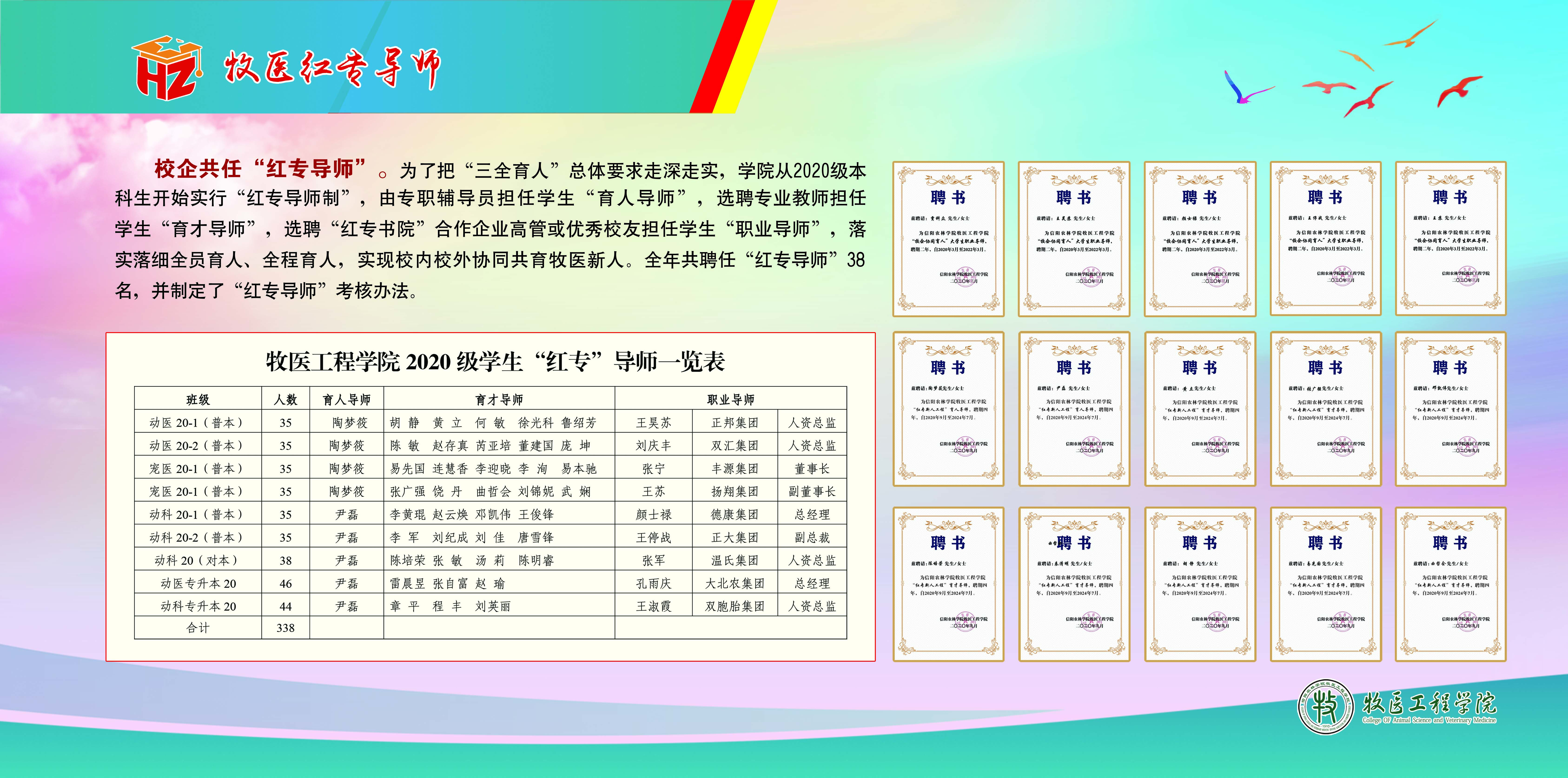 为了把“三全育人”总体要求走深走实,学院从2020级本科新生开始实行“红专导师”制,即专职辅导员担任学生“育人导师”,专业教师担任学生“育才导师”,企业高管、优秀校友、知名人士担任学生“职业导师”。让每位学生在大学期间都有三位导师,真正实现全方位成长成才。同时也让专业教师、校外人员参与学生培养,进一步夯实校内校外协同育人,落实落细全员育人、全程育人。(见附件)