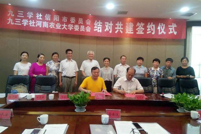信阳市委统战部党派科科长郭祥辉,九三河南农大委员会副主委、植保学院王红卫教授,九三河南农大委员会秘书长、外国语学院张莉教授,九三河南农大委员会副秘书长、河南职业技术学院张志强教授,九三河南农大委员会委员、华北水利水电大学支社主委郭选英教授,九三学社信阳市委副主委、信阳师范学院计算机学院邬长安教授,九三学社信阳市委副主委、秘书长李华,平桥区政协副主席、九三学社信阳市委委员、平桥支社主委马骥,以及九三学社信阳市委办公室主要同志、农林学院支社骨干社员,合作基地、信阳市明港大丰收农业专业合作社董事长张厚山总经理等参加签字仪式。