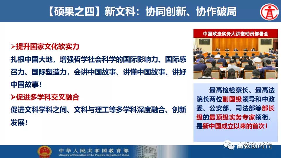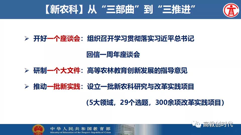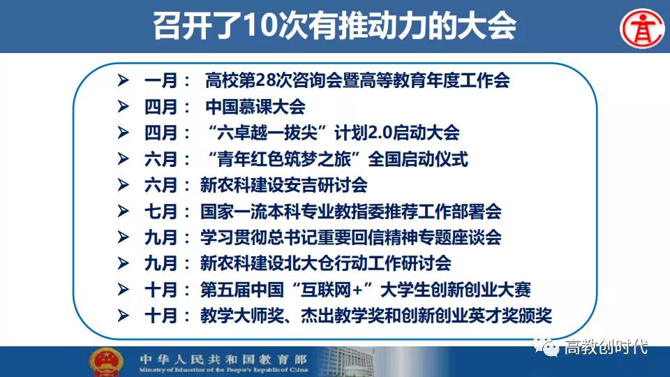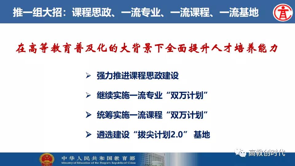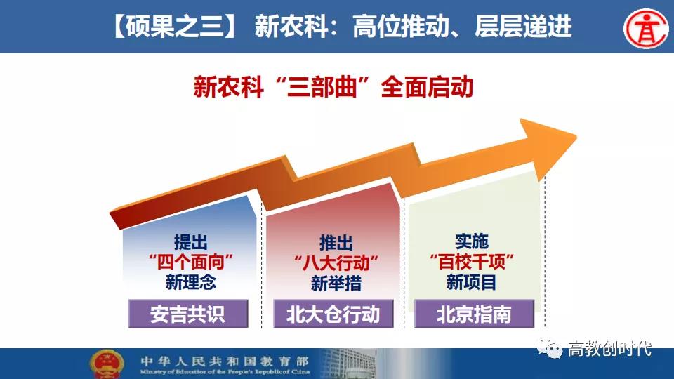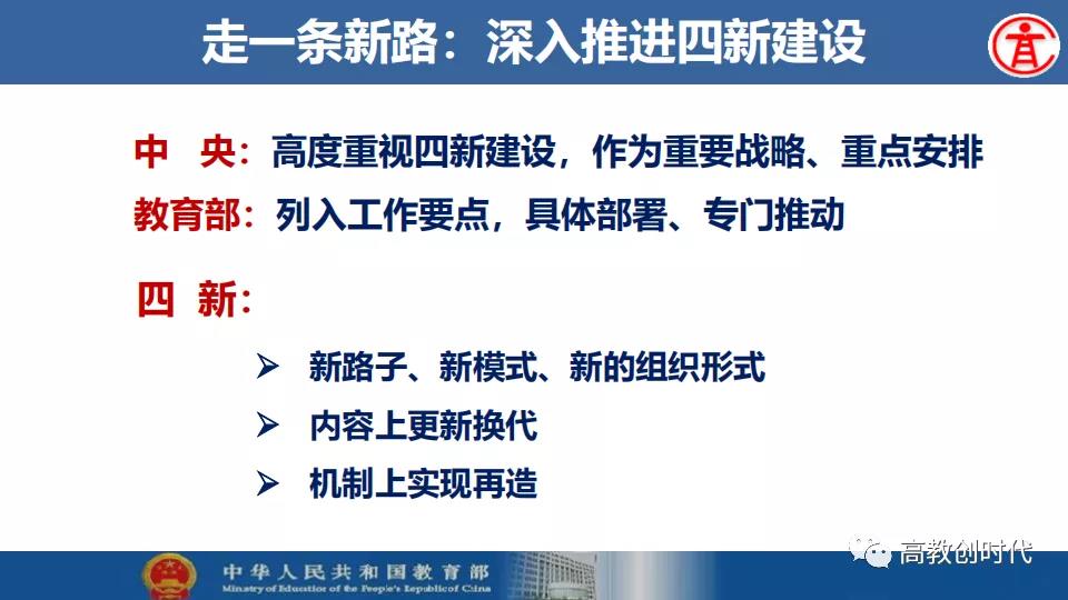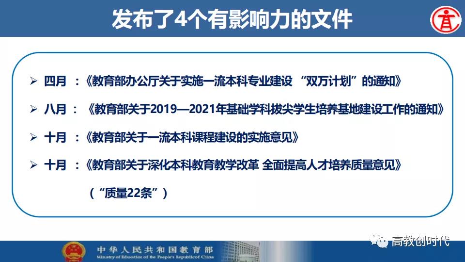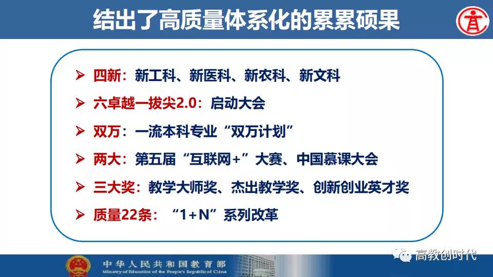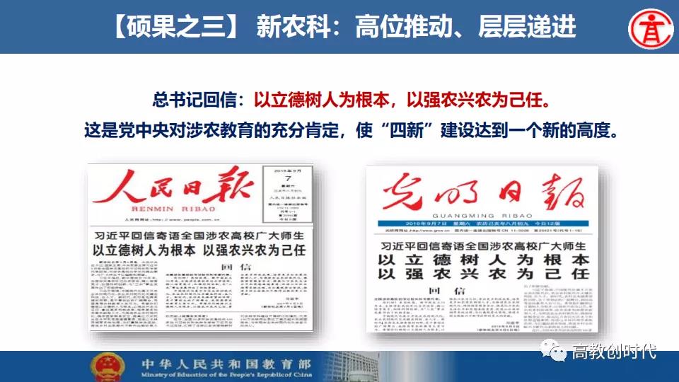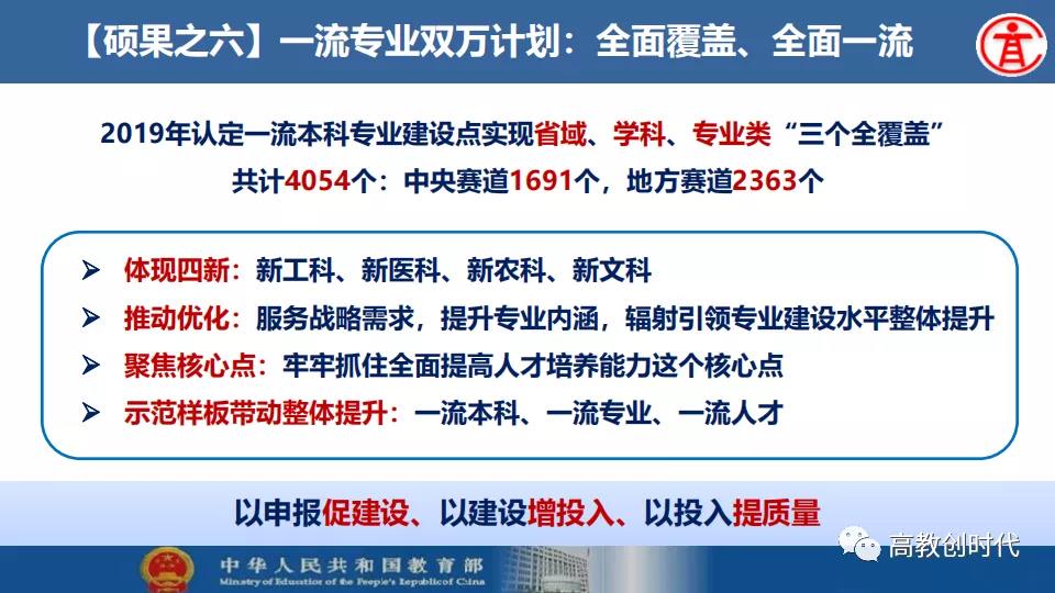 吴岩介绍,2019年,全国高等教育战线深入贯彻落实习近平总书记给全国涉农高校的书记校长和专家代表回信精神,大力推进新农科、新文科、新工科、新医科“四新”建设以及“六卓越一拔尖计划”2.0、一流专业“双万计划”、“互联网+”大学生创新创业大赛等各项工作。首批推出4054个一流本科专业建设点,实现省域、学科、专业类“三个全覆盖”,辐射引领全国高校专业建设水平整体提升和人才培育质量全面提升。