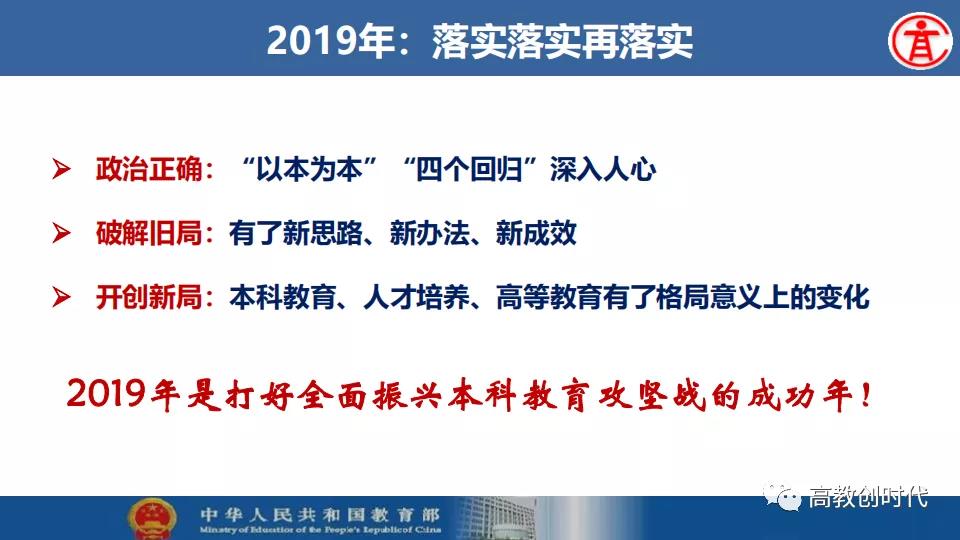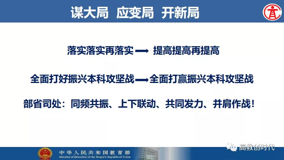 吴岩要求,要走一条新路,加快推进新医科建设、深化新工科建设、积极推进新文科建设、持续推进新农科建设。要下一盘大棋,办好第六届“互联网+”大学生创新创业大赛,举办世界慕课大会、持续推动人才培养范式变革和“学习革命”深入开展。要布一个大局,推进新时代中西部高等教育振兴。要推一组大招,深入推进高校课程思政建设、推进一流课程建设“双万计划”、启动“基础学科拔尖学生培养计划2.0”基地遴选,努力打好打赢全面振兴本科教育攻坚战。