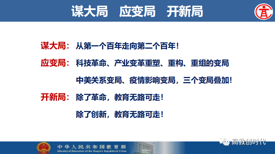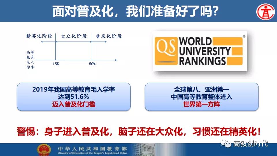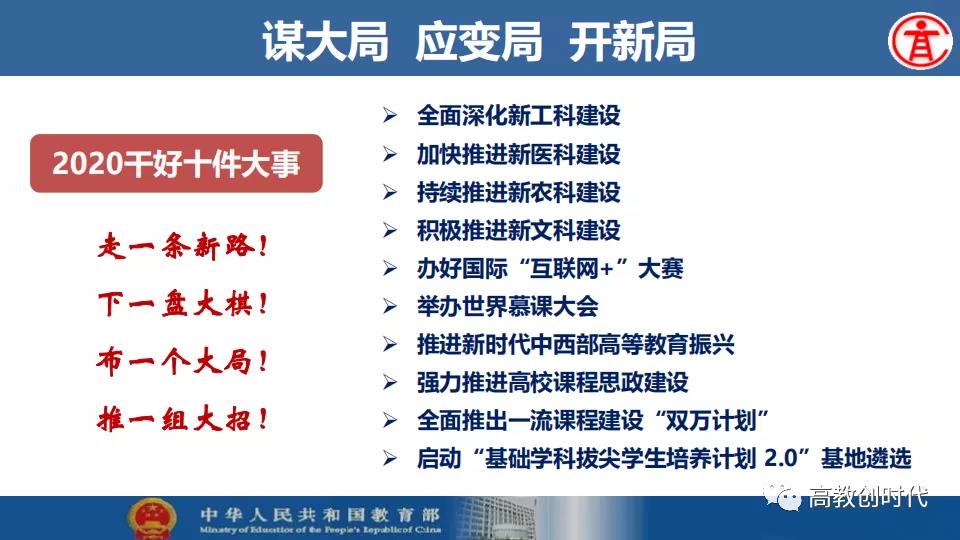 吴岩强调,2020年,高等教育要在中华民族伟大复兴战略全局、世界百年未有之大变局“两个大局”中,主动适应我国高等教育进入普及化阶段的新形势新要求,收好官、开好局。