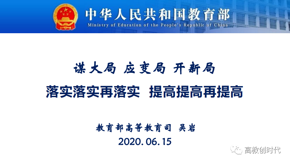 6月15日,2020年全国高教处长会暨高等学校教学指导委员会工作会议召开。教育部高教司司长吴岩出席会议并作以《谋大局 应变局 开新局——落实落实再落实 提高提高再提高》为主题的主旨报告。