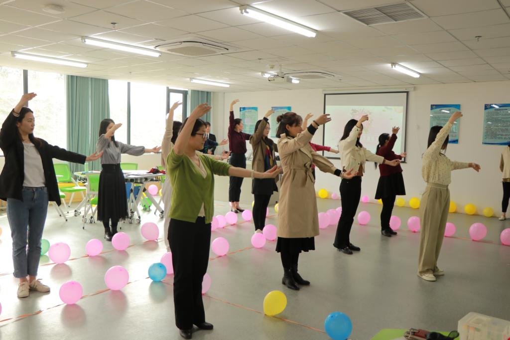 教师学习礼仪操,体验礼仪之优美。第二项活动是陈芳老师的礼仪操实践,在广大女性教职工的热切期盼中,陈芳老师开始了礼仪操的展示与现场指导,她认真仔细地对每一个肢体动作做详细讲解,并以标准优雅的动作给女老师们做出示范,大家在轻松愉悦的氛围中练习礼仪操,努力做一个优雅、亲和、温柔知礼的女教师。此项活动对女教师们提高自我修养、强化礼仪观念起到了积极的引导作用。
