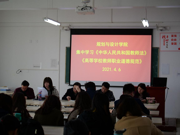 为推进新时代师德师风建设,进一步凝聚师德正能量,激励我院广大教师和教育工作者不忘立德树人初心,厚植爱国情怀,2021年4月6日下午,规划与设计学院党总支在二教514召开师德师风理论学习会,全体教职工参加会议。