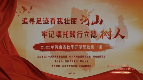 秋季开学第一课以“追寻足迹看我壮丽河山,牢记嘱托践行立德树人”为主题,分为“河”“山”“树”“人”四个篇章,在习近平总书记历次考察河南纪实的视频中拉开序幕。河南大学刘嘉尧老师、河南财政金融学院张珺倩老师、河南农业大学刘宁静老师、郑州航空工业管理学院侯丽羽老师分别以“黄河之畔的‘大思政课’——有知有味”“大别山麓的‘大思政课’——讲透讲活”“焦桐树下的‘大思政课’——至情至深”“走进人民的‘大思政课’——见实见效”为题,讲述了黄河治理、大别山精神、焦裕禄精神、丹江口水库移民搬迁等主题思政课。