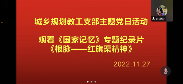 为深入学习贯彻党的二十大精神和习近平总书记考察河南安阳重要讲话精神,引导广大党员干部深刻理解把握红旗渠精神的丰富内涵1127下午城乡规划教工支部通过腾讯会议召开弘扬红旗渠精神、赓续红色血脉主题党日活动。