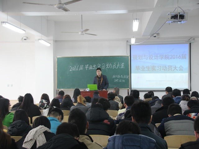 12月24日下午三点,规划与设计学院在二教207举行2016届毕业生实习动员大会。院副书记王国艳、团总支书记徐曼、教学科研秘书姚令华、各教研室主任、专业指导老师及200余名毕业生参加了此次会议。会议由办公室主任严兆洋主持。