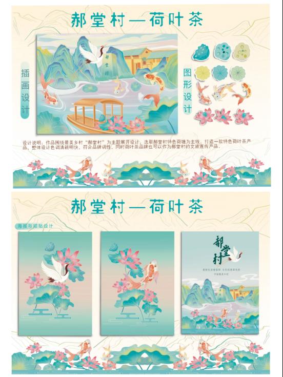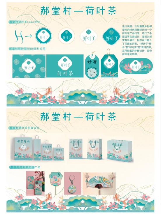 作品围绕最美乡村“郝堂村”为主题展开设计,选取郝堂村特色荷塘为主线,打造一款特色荷叶茶产品,整体设计色调清新明快,符合品牌调性,同时荷叶茶品牌也可以作为郝堂村的文旅宣传产品。