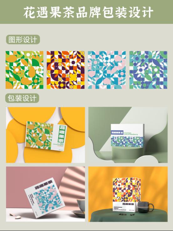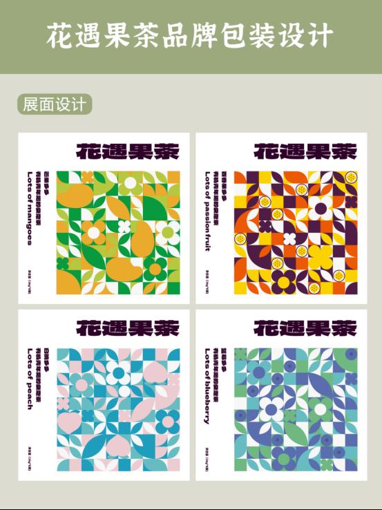 现信阳毛尖市场上的主要受众群体是中老年群体,缺乏年轻活力, 而花遇果茶则是主打以年轻人为主要消费群体的信阳毛尖新茶饮品牌形 象。传统的信阳毛尖茶与水果的碰撞,激发年轻人的热情,具体有芒果味, 白桃味,蓝莓味与百香果味。不同口味的包装运用不同的形象符号与色彩 来区分,并且都还加以茶叶与花朵的符号来强化品牌特性,将茶叶,花与 水果等符号用清冽的色彩连结,包装传达出温润的茶香与多层次的口感, 以此来拓宽更年轻的信阳毛尖茶饮市场,让消费者记住每一种口味。