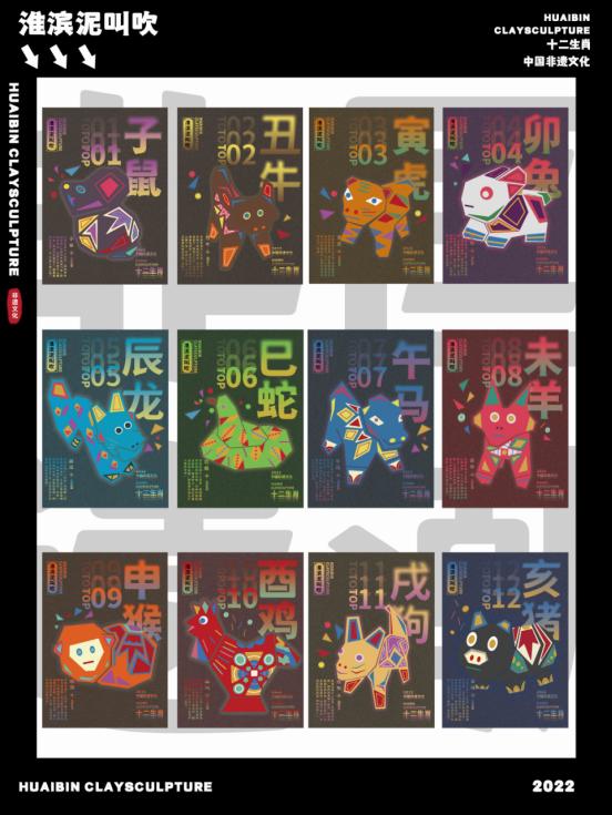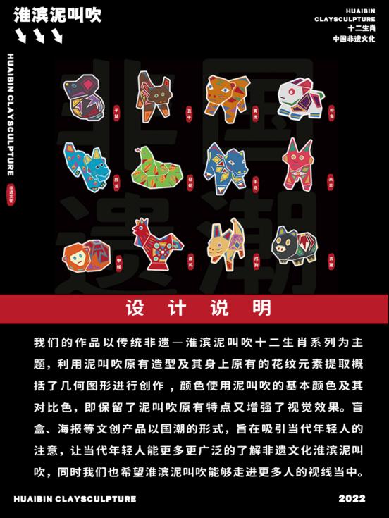 本设计作品以传统非遗—淮滨泥叫吹十二生肖系列为主题,利用泥叫吹原有造型及其身上原有的花纹元素提取概括了几何图形进行创作,颜色使用泥叫吹的基本颜色及其对比色,即保留了泥叫吹原有特点又增强了视觉效果。盲盒、海报等文创产品以国潮的形式,旨在吸引当代年轻人的注意,让当代年轻人能更多更广泛的了解非遗文化淮滨泥叫吹,同时本作品也希望淮滨泥叫吹能够走进更多人的视线当中。
