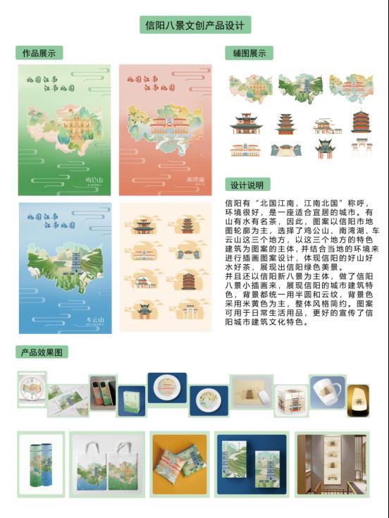 信阳有“北国江南,江南北国”称呼,环境很好,是一座适合宜居的城市。作品选择以信阳市地图轮廓为主,图案选择信阳当地的山水茶以及建筑,分别为鸡公山、南湾湖、车云山这三个地方,并且以这三个地方的特色建筑为图案的主体,来进行插画图案设计,体现信阳的好山好水好茶,展现出信阳绿色美景。同时小插图也以建筑为主,赋予地域性,更能体现主题性。