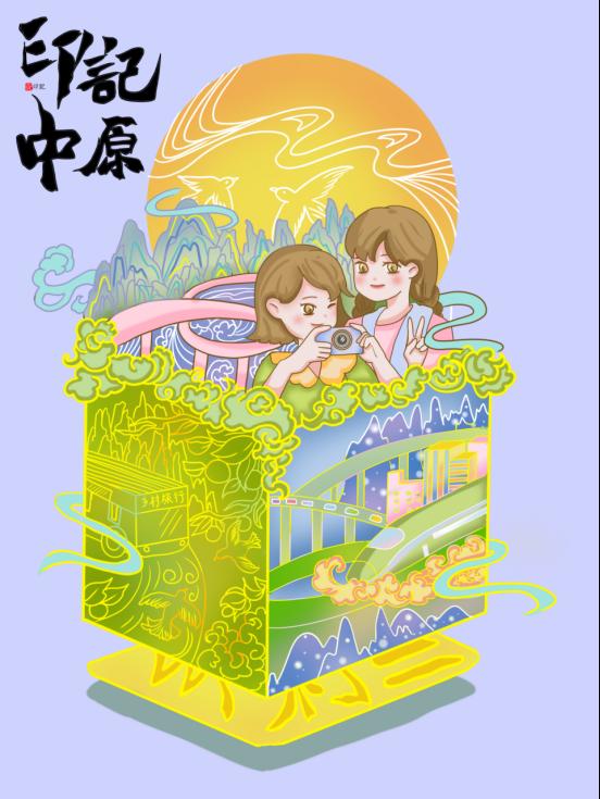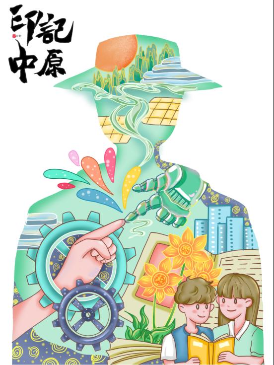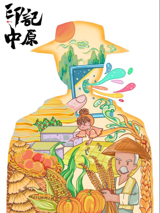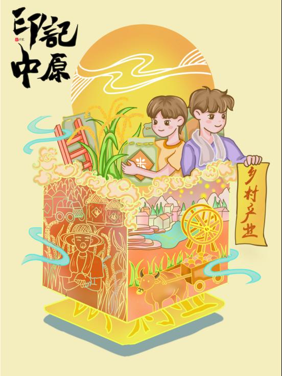 印记中原这一系列海报是围绕乡村题材来创作的,乡村的印象在每个人心里面都有一个固定的情景,绿水青山,培育很好的农作物,麦田和美食,同时乡村也在不断发展的更好,科技化的乡村已经形成了。所以这一系列海报中分别围绕乡村的产业,科技,旅游和美食来表现,整个轮廓是印章的形状,正符合了主题“印”字。