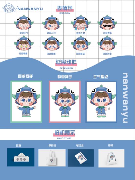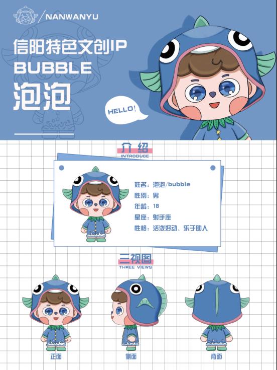 泡泡文创设计整体是由一种南湾鱼来设计的,设计灵感来源于信阳南湾湖的特色鱼类南湾鱼。南湾鱼是信阳著名的一种特色土特产,深受广大群众欢迎。结合鱼头的形象和玩偶服的特点,运用靓丽的蓝色、绿色、粉红色来设计他的服饰。整体俏皮可爱富有活力气息。他的颈饰是由信阳毛尖串成的披肩,极富有信阳特色,下方还有翻涌的浪花,表示南湾湖对泡泡的孕育。其个性温和,与信阳的城市形象也有着很好的结合。更加突出信阳的乡村特色。