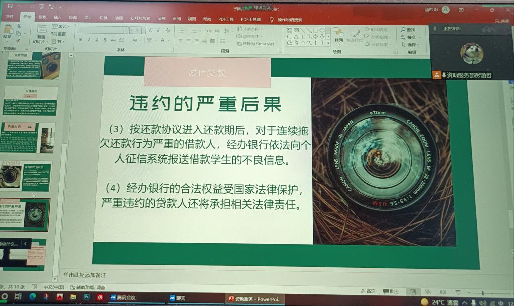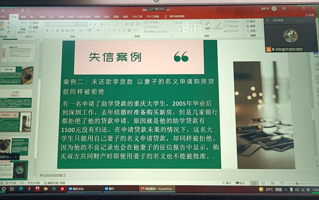 本次活动通过进行线上宣誓承诺,讲解履约规定和还款流程,重点结合违约失信案例,信用违约及不良征信记录可能带来的严重后果,教育学生知法守法、忠实履约、诚信还贷,强化诚信警示教育。