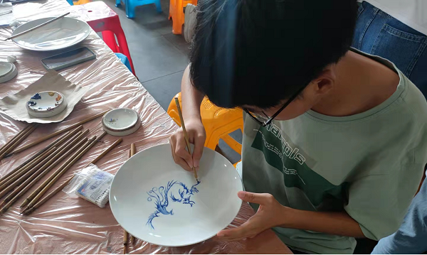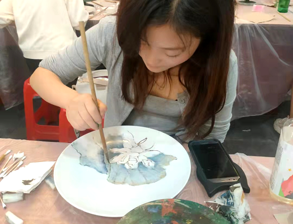 在10月16日,文明示范班到江西景德镇的陶溪川、雕塑瓷厂、古县衙等地展开考察,让示范班同学们感受景德镇浓厚的陶瓷文化氛围。10月17日,文明示范班进行画瓷盘活动,期间,由专业老师对文明示范班学生进行画瓷盘绘画技法的讲解和绘画实操步骤的演示,文明示范班同学们皆兴致勃勃的积极参与画瓷盘活动中,他们根据自身对传统文化的理解,将荷花、梅、兰、竹、菊、鸟、鱼等大自然的事物通过绘画的表现形式艺术性的描绘在陶器瓷盘上,赋予瓷器独特的美好寓意,使同学们真切的体验了中国传统陶瓷文化的艺术魅力。