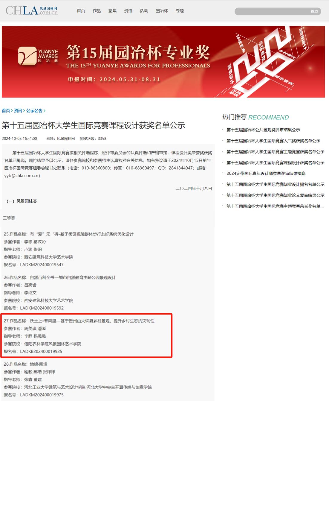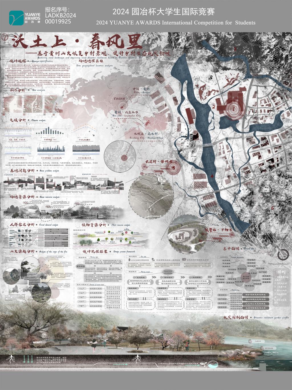 近日,第十五届园冶杯大学生国际竞赛所有获奖名单揭晓,我院教师李静、杨璐璐指导的22级风景园林专业周美琪、潘溪同学的设计作品《沃土上·春风里—基于贵州山火恢复乡村景观,提升乡村生态抗灾韧性》荣获三等奖和人气奖,风景园林艺术学院荣获“先进教育集体”和“优秀组织奖”。