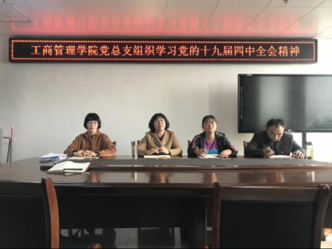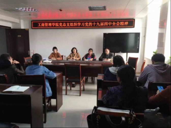 2019年11月5日,工商管理学院党总支在党员活动室717组织学习党的十九届四中全会精神。此次会议由我院院长潘一平主持。
