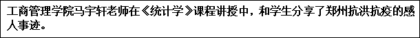 按照学校《2021年秋季开学思政第一课实施方案》要求,在9月6日,工商管理学院教师通过线上平台为学生上了“开学第一课”,如何引导学生把“灾难当教材,与祖国共成长”是每个教育人要思考的内容。为了引导学生学好“灾难教材”,勇于担当,工商管理学院教师从专业教学的角度,引导同学们坚定理想信念,厚植家国情怀,以昂扬的斗志投入新学期的学习。