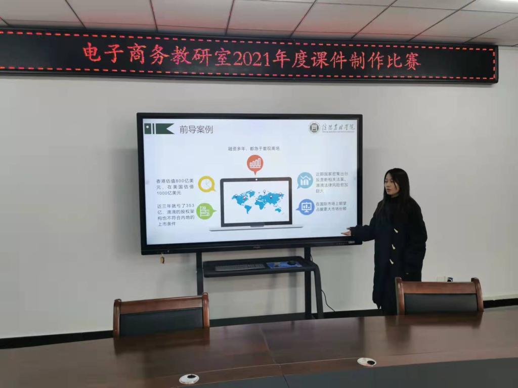 为提升教师应用新资源和创新的能力,鼓励教师进行多媒体教学课件制作与开发,推动我院信息技术教育普及和发展,电子商务教研室于2021年12月17日在双创中心215举办了课件制作比赛。
