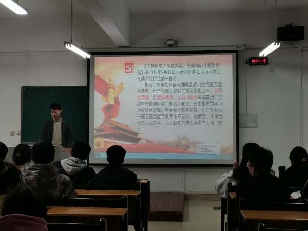 《了解历史才能看得远,永葆初心才能走得远》是2019年9月18日习近平同志在河南考察工作结束时讲话的一部分,具有重要的学习意义。辅导员老师详细介绍了焦裕禄精神、红旗渠精神、大别山精神,让同学们进一步了解我们党的精神财富,并鼓励同学们不断加强自身党性教育,学好党史、新中国史,用好红色资源。