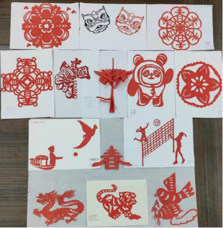 此次剪纸方式是用剪刀或刻刀在纸上剪刻花纹,同学们积极踊跃参与。大家在裁剪的过程中有的手法生疏,有的手指灵活,产生的作品有神态各异的老虎、可爱的青蛙、立体式的春天等,丰富而精彩。活动选取优秀作品进行展览并给予奖励。