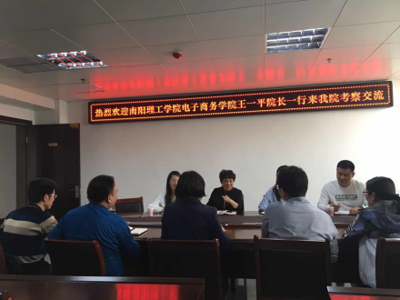 4月18日下午,南阳理工学院电子商务学院王一平院长一行四人到我院进行考察交流,工商管理学院院长潘一萍教授、办公室主任张世军副教授、电子商务专业教研室主任潘玉辰、市场营销专业教研室主任周其文及相关专业教师参加了本次座谈会。