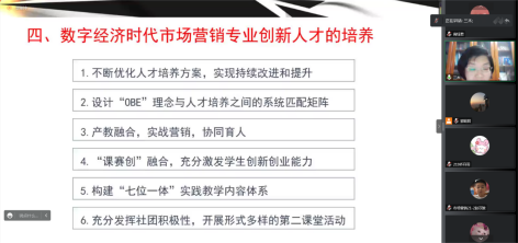 为积极探索先进教育理念与专业教育实践有效融合,优化创新人才培养模式,实现人才培养质量的稳步提升。2022年12月14日,工商管理学院邀请南阳理工学院卜森教授做了一场“数字经济时代市场营销专业创新人才培养”的线上学术报告,我院全体师生参与此次报告,会议由市场营销教研室主任郭昭君主持。