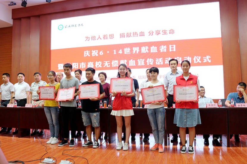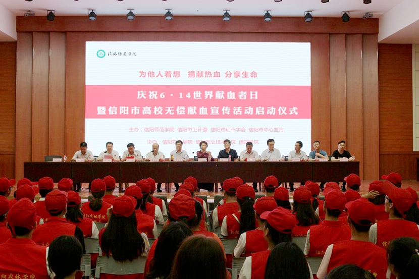 6月14日下午,信阳市庆祝6.14世界献血者日暨信阳市高校无偿献血宣传活动在信阳师范学院逸夫楼报告厅举办。信阳师范学院、信阳市卫生和计划生育委员会、信阳市中心血站负责同志及信阳市各高校师生代表参与了此次活动。