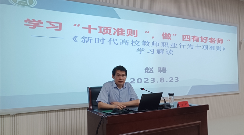 开班仪式后,赵聘以《学习“十项准则” 争做“四有好老师”》为题,为新教师们作了开班第一讲。赵聘结合详实案例,详细解读了《新时代高校教师职业行为十项准则》,勉励新教师们上好师德修养“必修课”,争做“四有好老师”,夯实新入职教师的育人基础。