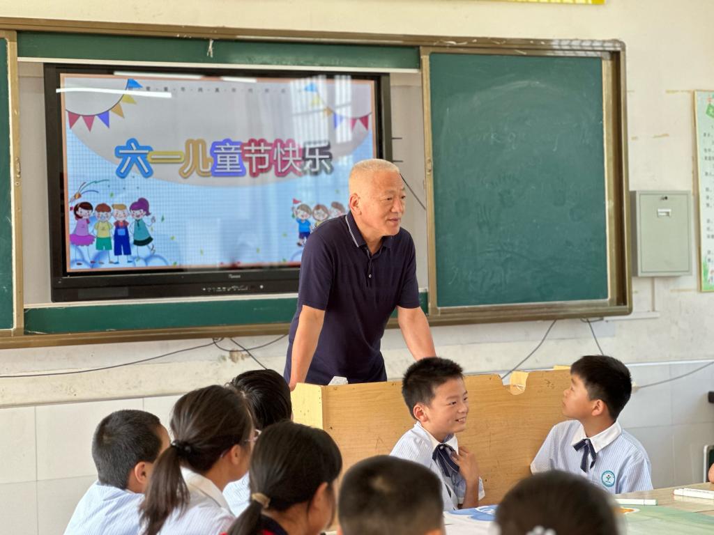 退休教师滕海为孩子们带来了一堂生动有趣的英语课,讲授了关于儿童节的英文表达和文化知识。孩子们聚精会神,对英语的兴趣被进一步激发,一边学习一边将习得的知识写在条幅上,师生一起写下节日的美好祝福。