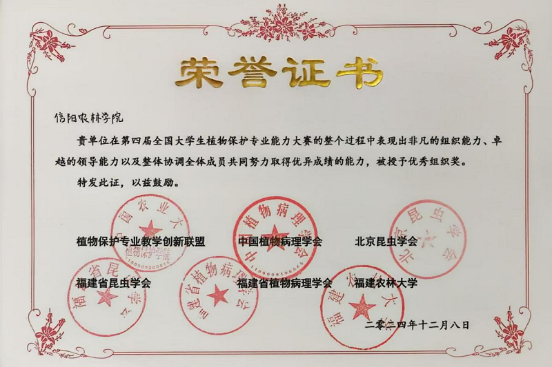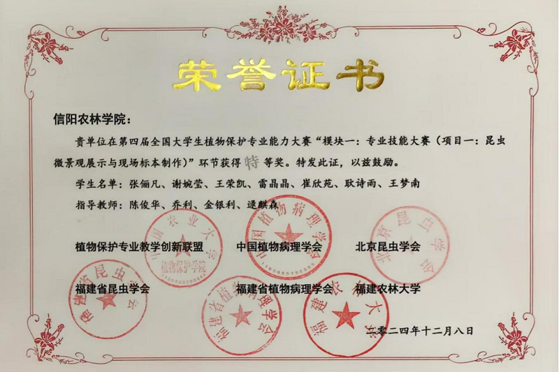 12月6日至9日,第四届全国大学生植物保护专业能力大赛在福州举行,beat365在线平台官网农学院学生共斩获特等奖1项、一等奖1项、二等奖1项,三等奖7项,beat365在线平台官网荣获“优秀组织奖”。